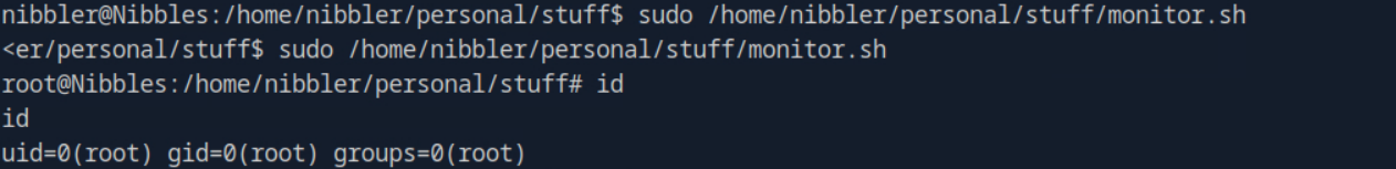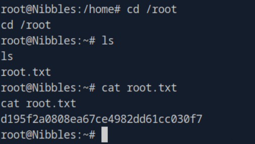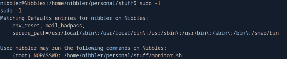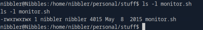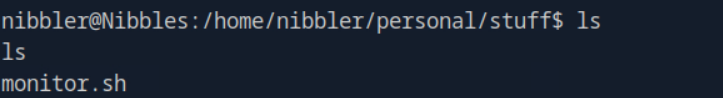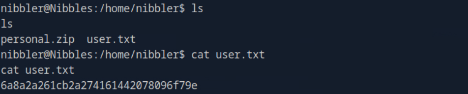From here we will navigate to nibbler’s home directory. Running the ls command in /home/nibblerreveals two files: personal.zip and user.txt .