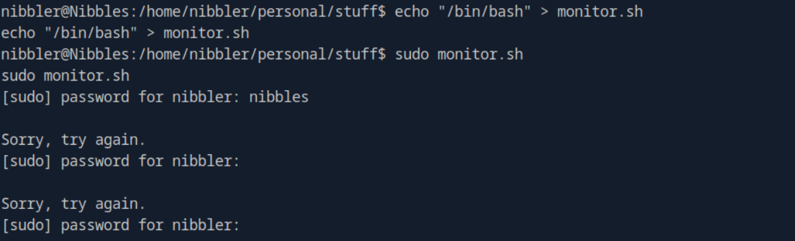 After doing that, we can run sudo monitor.sh to generate a root shell. However, we are prompted with entering a password that we do not know.