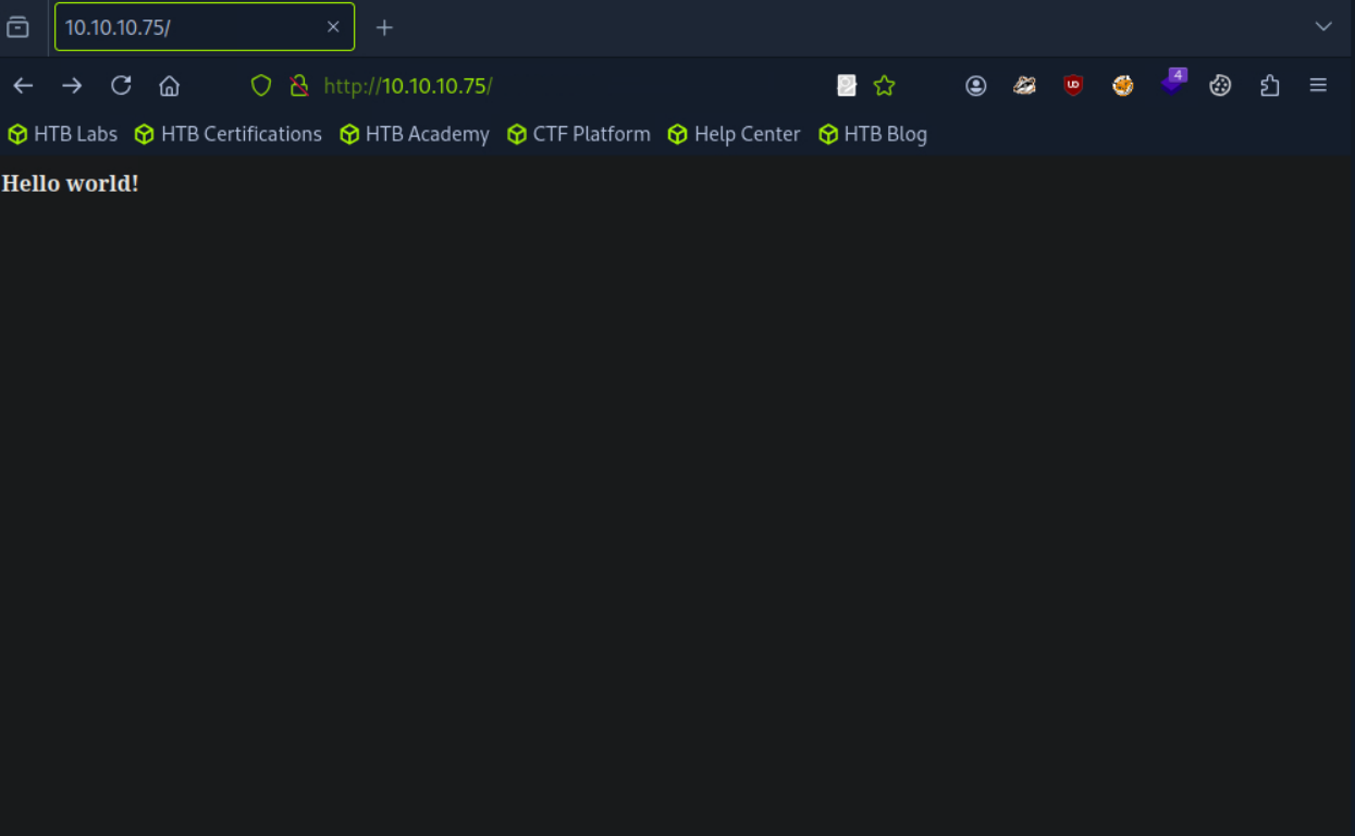 From the nmap scan we can notice a webserver running, upon accessing the website, we are greeted with a Hello World!