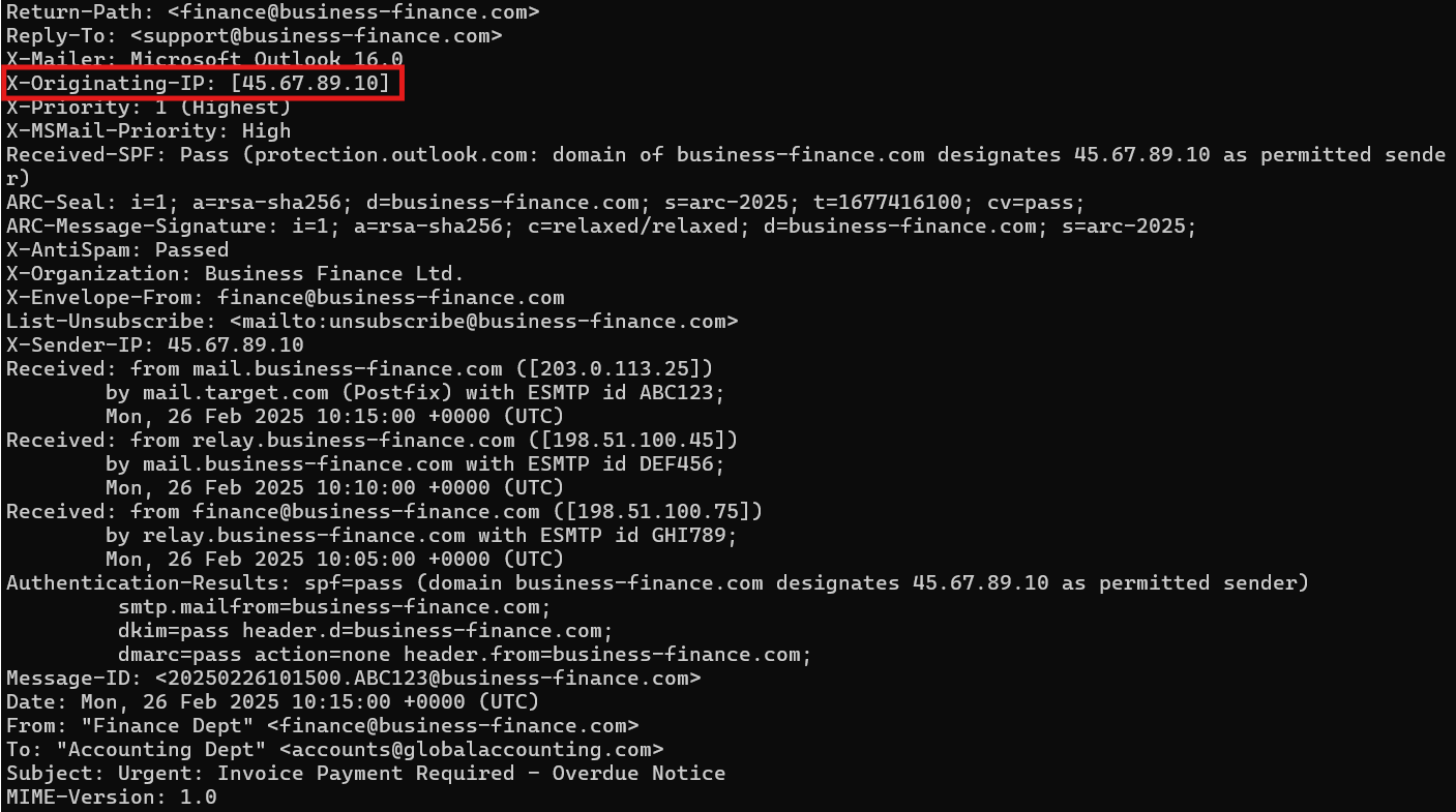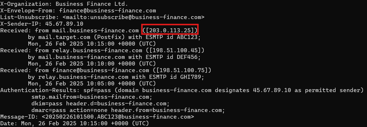 203.0.113.25delivered the message to the victim's mail servermail.target.com.