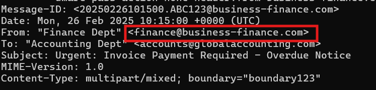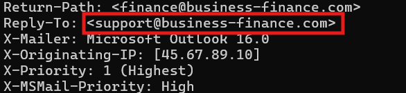 Checking the Reply-To: will reveal the email address. Note that the email in this header is different from the From: header address. This is a common phishing technique. Attackers typically use a sending email only used to send mass phishing emails. Having the Reply-To: header be different allows for replying messages to be redirected to a mailbox that is actively monitored for responses. In a legitimate email, the finance department sending an invoice would want replies to go back to that same address. There is not reason for replying mail to be sent to a different address unless used for a phishing attack.