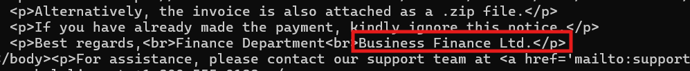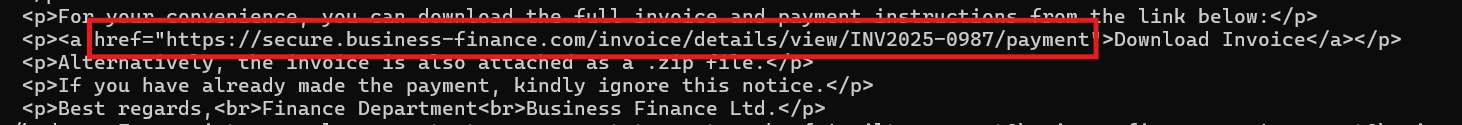 The URL embedded in the HTML is hxxps[://]secure[.]business-finance[.]com/invoice/details/view/INV2025-0987/payment (defanged). The domain is typically found after the protocol. In this case, it comes after https:// . The domain is secure.business-finance.com . Adding the secure domain can add a false sense of legitimacy since the word "secure" can be seen as trustworthy.