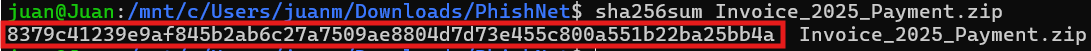 After opening the email, we can save the attachment to any folder and run the sha256sum command to retrieve the SHA-256 hash of the attachment.